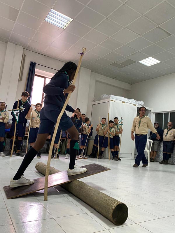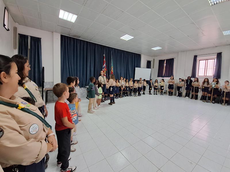 A cerimónia decorreu no salão paroquial, onde os escuteiros, acompanhados por dirigentes e alguns familiares, participaram em pequenos jogos simbólicos que representaram a transição entre secções.